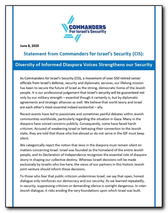 As Commanders for Israel’s Security (CIS), a movement of over 550 retired senior officials from Israel’s defense, security and diplomatic services, our lifelong mission has been to secure the future of Israel as the strong, democratic home of the Jewish people. It is our professional judgement that Israel’s security will be guaranteed not only by our military strength – essential though it certainly is, but by diplomatic agreements and strategic alliances as well. We believe that world Jewry and Israel are each other’s most essential – indeed existential – ally.